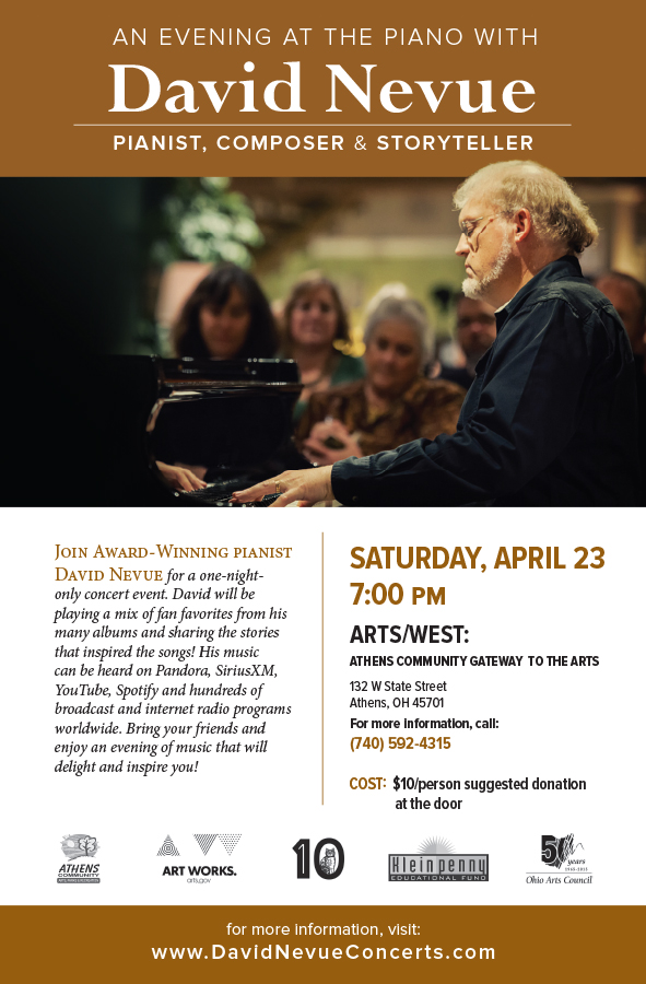 Come to ARTS/West at 7 pm on Saturday, April 23rd for a one night only concert with David Nevue. David will be playing a mix of fan favorites from his many albums and sharing the stories that inspired the songs! Bring your friends and enjoy an evening of music that will delight and inspire you. A $10/person suggested donation will be collected at the door.